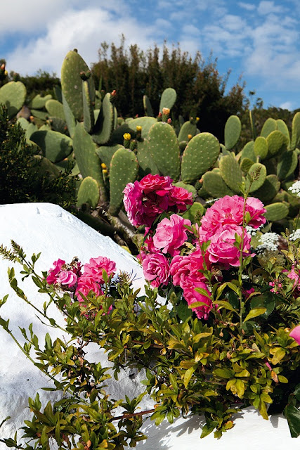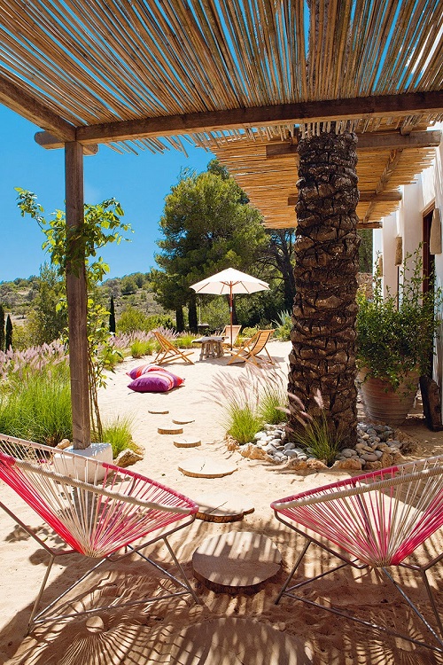 Pero ahora que llega el buen tiempo me gusta transformar todo eso y crear un pequeño rincón con plantas y un sitio agradable para pasar buenos ratos. Tengo un pequeño arriate con tierra, una palmera, un limonero, paredes encaladas y suelo de cemento. Y para la decoración un banco de caña vintage y su butaca redondeada a juego, una mesita baja, algunas plantas crasas y algunas con flor en tiestos de barro. Me falta quizá una alfombra, algunos cojines y algún detalle más.